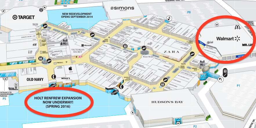 Mississauga’s Square One Shopping Centre will become North America’s only mall to feature both a luxury anchor and a Walmart store. A 120,000 square foot Holt Renfrew flagship is scheduled to open in the mall in the spring of 2016 and as far as we’re aware, the mall’s 225,000 square foot Walmart Supercentre will continue to operate.