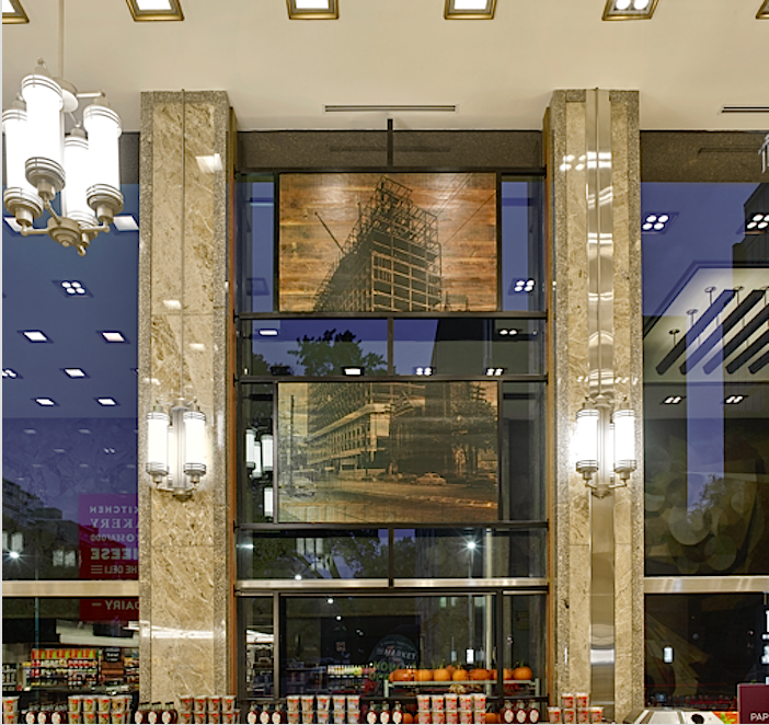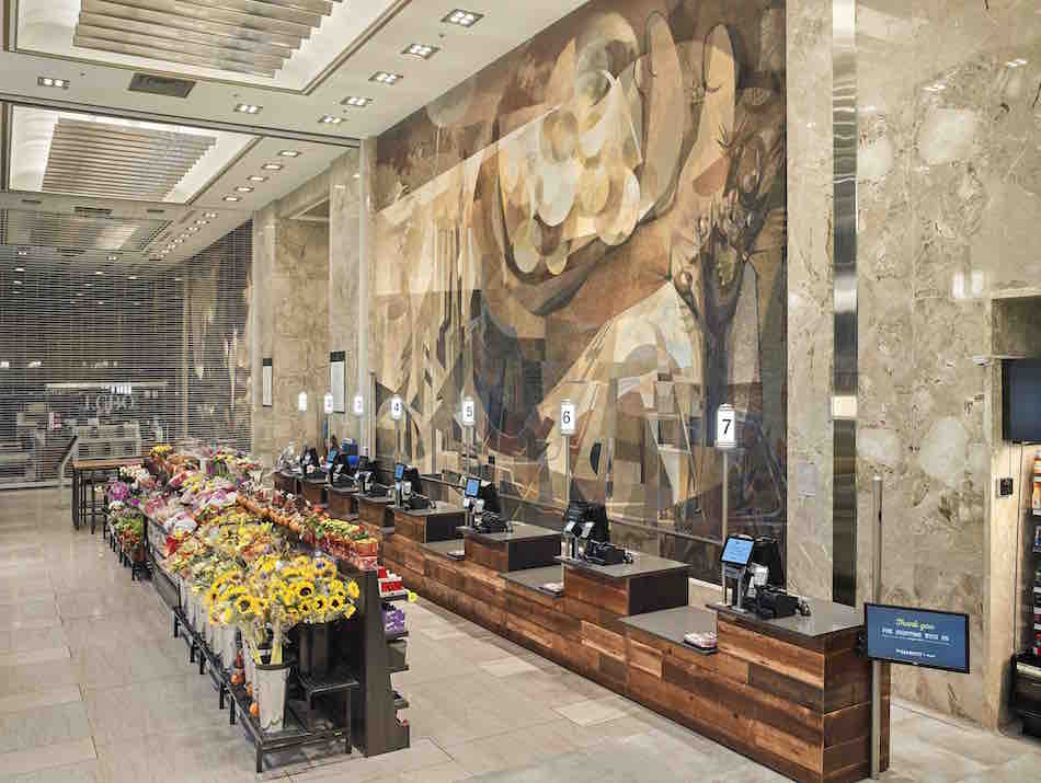Imperial Plaza tower was built in the mid 1950s, and is considered to be a masterpiece of mid-century International Style modernism. Originally the headquarters for Imperial Oil, the tower was recently repurposed into a 400-unit condominium building with retail at its base. A mural called “The Story of Oil” by R. York Wilson is located at Longo’s checkouts — a nod to the building’s heritage. The store also incorporates marble and granite from the original office building.