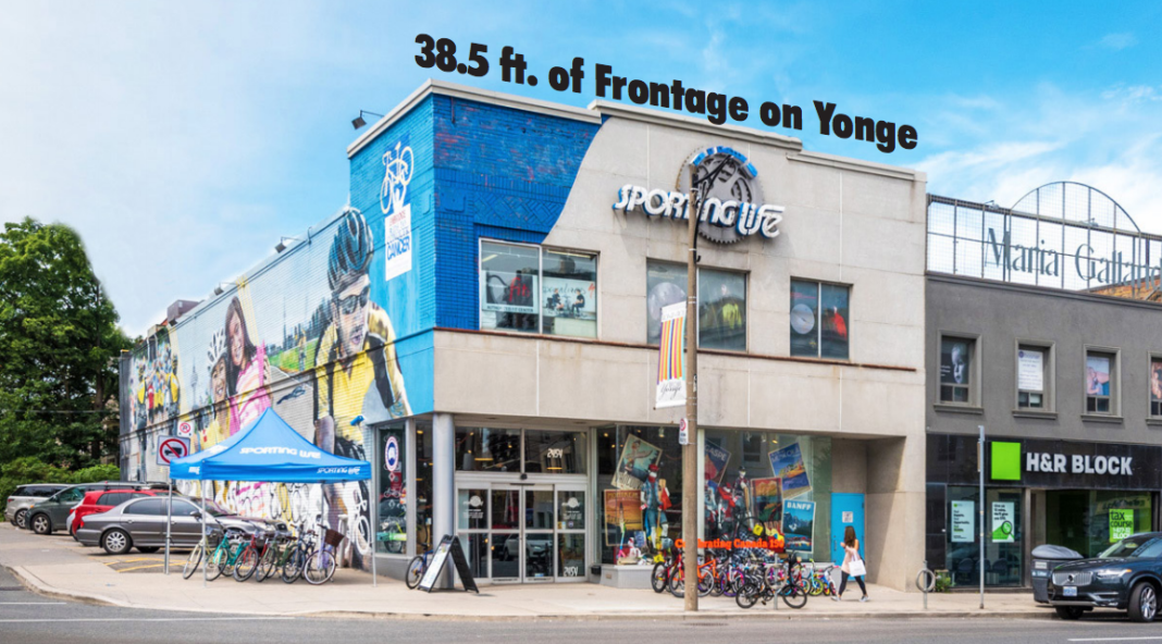 An notable retail building is for sale at 2454 Yonge Street in midtown Toronto, currently housing Sporting Life Bikes & Boards as a single tenant. The bid date for interested parties is September 14 of this year.