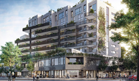 The eight storeys of residential above the retail and office floors are set back from the podium. The third level has a large outdoor terrace with a community garden, amenities and a greenhouse.