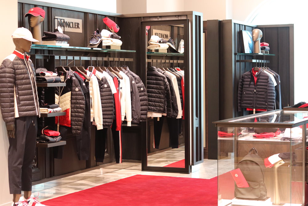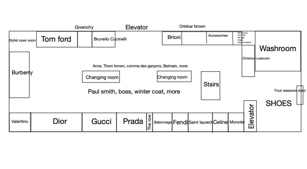 Vendor shops for brands such as Balenciaga, Brioni, Burberry, Brunello Cucinelli, Celine, Dior, Fendi, Givenchy, Gucci, Moncler, Prada, Saint Laurent, The Row, Tom Ford and Valentino are showcased along the periphery, with several set to open soon as construction progresses. Other well-known designer brands include Thom Browne, Balmain, Givenchy, Junya Watanabe, Comme des Garcons, Acne and others.