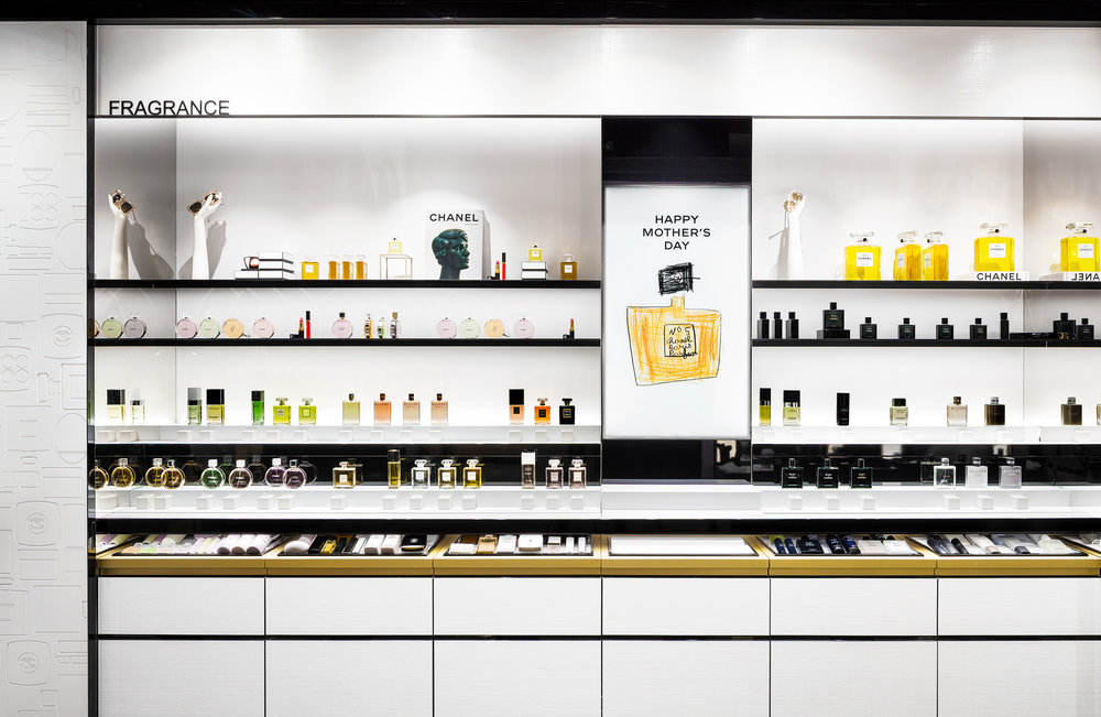 Digital signage throughout the boutique changes depending on the time of year. This week, the theme is ‘Happy Mother’s Day’ with displays featuring a cartoon-like drawing of a bottle of the iconic Chanel No. 5 fragrance that is renowned worldwide.