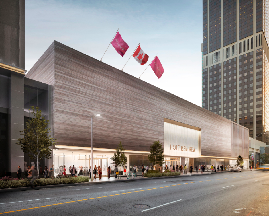 Large-format luxury retailer Holt Renfrew has provided an update on renovations to its 190,000 square foot Bloor Street flagship at 50 Bloor Street West in Toronto, including renderings of a new facade and restaurant space, as well as more information on its interior renovations. The project is ongoing into 2020 and will see a refreshed space that will anchor the eastern end of Toronto’s famed ‘Mink Mile’.