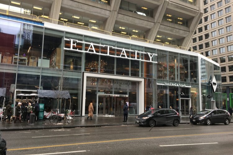 Eataly’s main entrance on November 13, 2019. A Van Cleef & Arpels jewellery boutique, operated by Birks, is located next to Eataly with prominent signage. photo: craig patterson