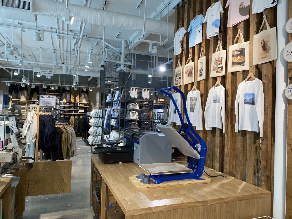 The main floor of the Guildford Muji store includes departments for stationery, health & beauty, kitchen & tableware, laundry/cleaning, storage, and furnishings for the living room and bedroom. Upstairs is women’s wear, men’s wear, children’s wear, accessories, bags & shoes, ‘inner wear’, and travel goods. The second level also includes Muji’s embroidery service and fabric print service. The Muji ‘aroma bar’ is temporarily not available, according to the company, as a safety measure due to COVID-19.